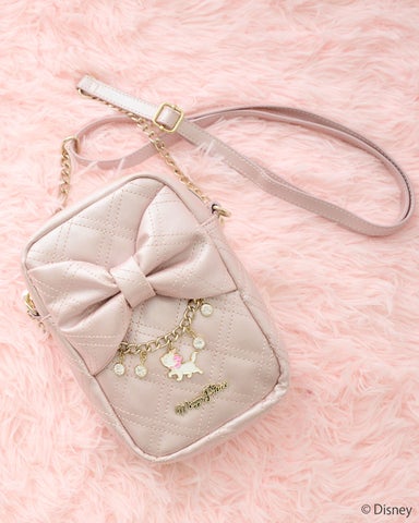 パールのように上品な光沢を放つ合皮素材に、立体的なキルティングとマリーちゃんチャームが華やかさをプラスします。内側はマリーちゃん柄の裏地付きで、スマートフォンや小物を入れて休日のお出かけをより特別なものに変えます。