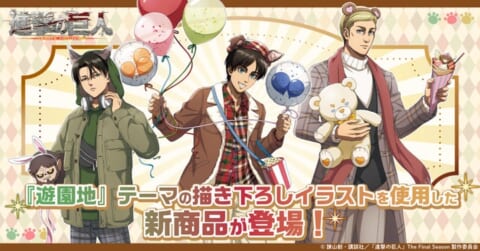 TVアニメ『進撃の巨人』より、エレン、リヴァイ、エルヴィンの新規描き下ろしイラストを使用した新商品が登場します。遊園地を楽しむキャラクターたちのイラストや、アトラクションに乗るミニキャライラストのアイテムがラインナップ。