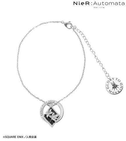 2Bと9Sのモチーフデザインチャームを付けたブレスレットです。ネックレスと同様に、チャームには2B、9Sのロールアウト日、月の涙、ブラックボックスが使用され、作品の世界観を表現しています。素材とディテールにこだわり、日常使いしやすいデザインに仕上げています。
