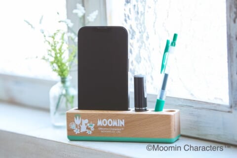 ムーミンのイラストが入ったデスクスタンドは、スマートフォンやペン、印鑑や名刺などを一箇所にまとめて収納できる便利なアイテムです。