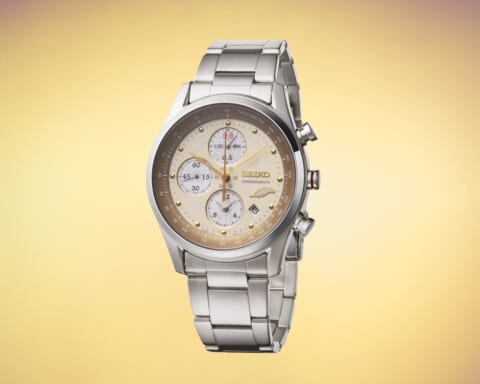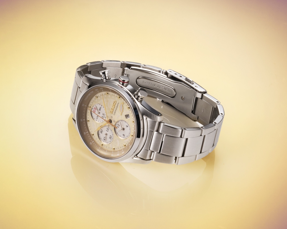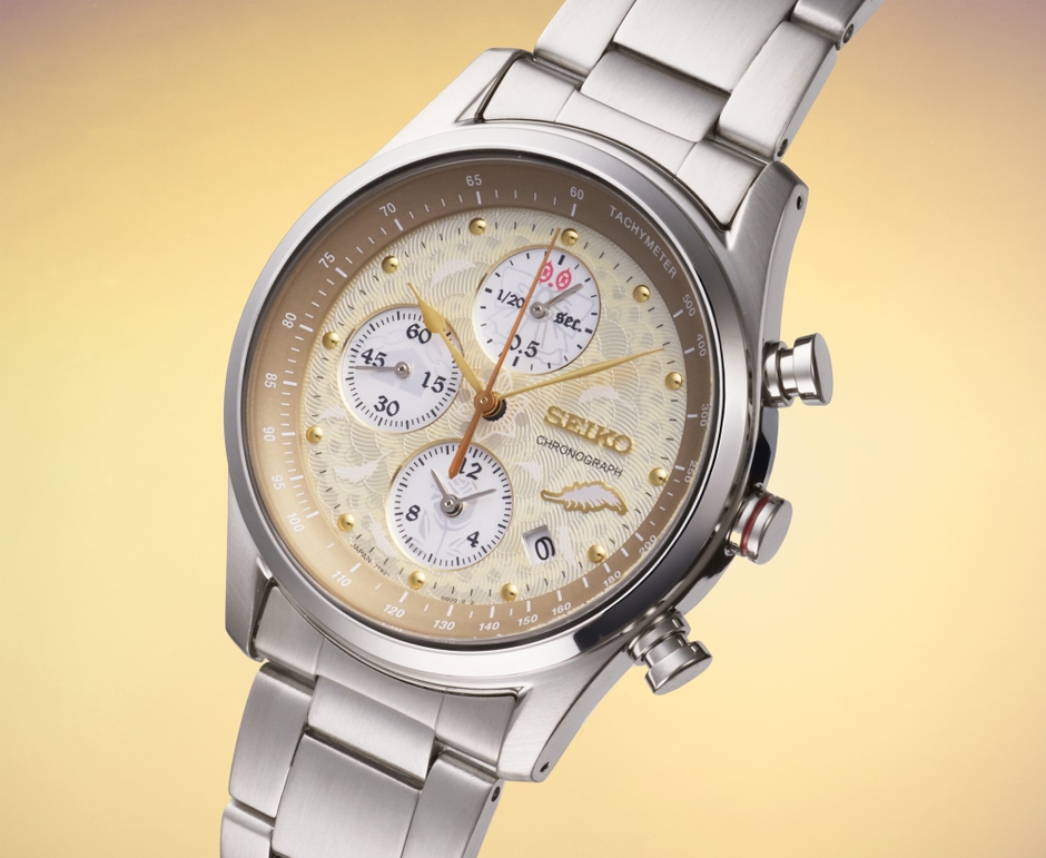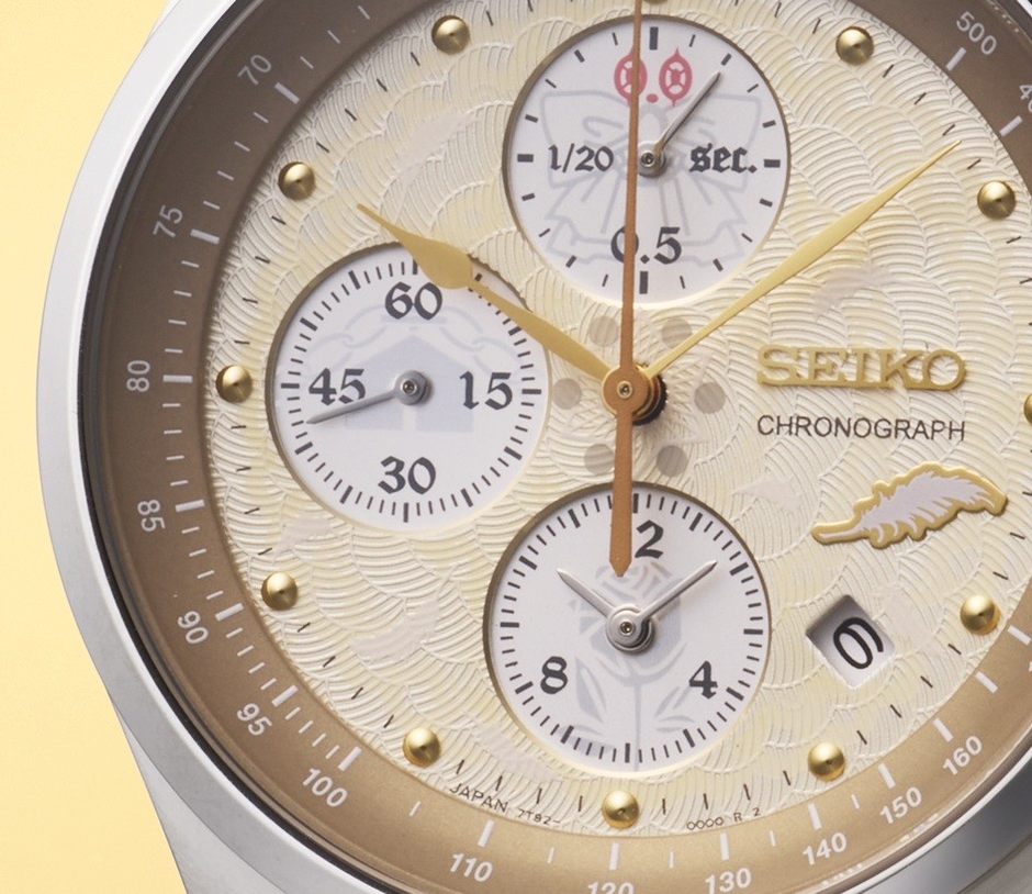 まどかモデルは、淡いシャンパンゴールドをダイヤルに採用し、上品でエレガントな雰囲気を演出します。サブダイヤルには、まどかの胸元のチェーンを彷彿とさせる繊細なモチーフやリボンをあしらいました。