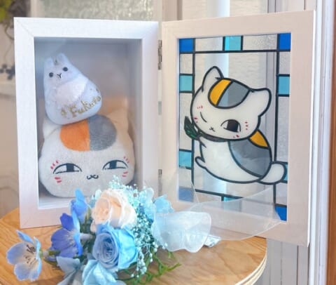 メインとなるグラスアートは、美しい花に囲まれたニャンコ先生をイメージしたパステル調の優しいデザインです。特殊なカラーフィルムとリード線(鉛線)を使用し、まるでステンドグラスのような風合いを再現しています。窓辺に飾ると陽の光を透かしてきらめき、夜は照明を受けて幻想的な雰囲気を醸し出します。時間帯によって変化する表情が、ニャンコ先生がそこにいるかのような温かさを感じさせます。