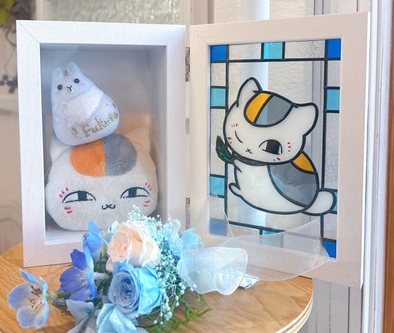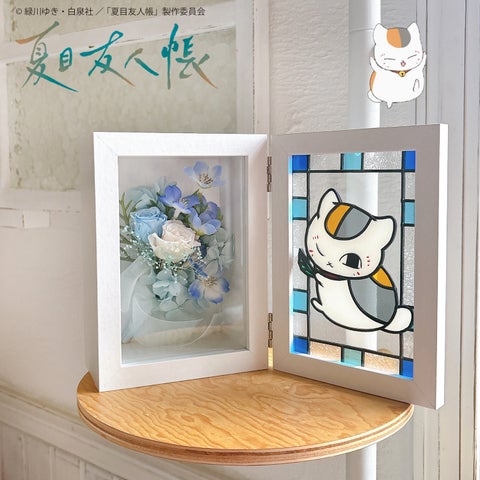 フレームを広げると、右側に「ニャンコ先生のグラスアート」、左側に「お花畑のブーケ」が並び、第十一話の情景がパノラマのように広がります。窓辺に置けば、グラスアートが陽の光を取り込み、ブーケと共にキラキラと輝く様子を楽しめます。