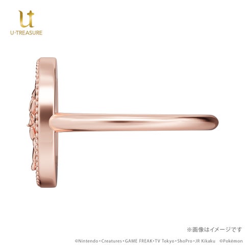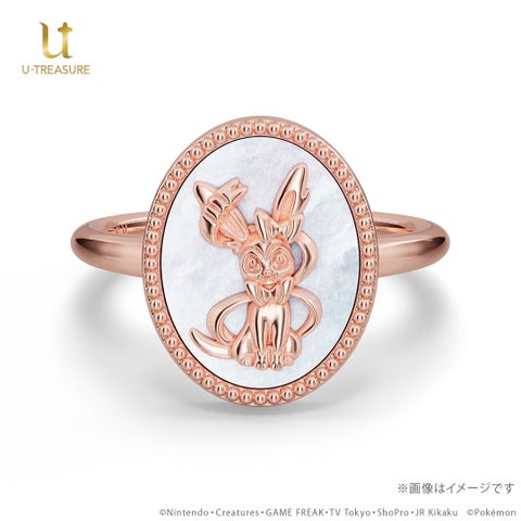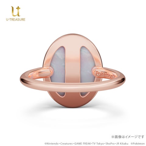 むすびつきポケモンのニンフィアをデザインに施したリングです。ネックレスと同様に、シルバーにピンクゴールドコーティングを施すことで、ニンフィアの癒やしの力を表現しました。ベースに使用したマザーオブパール(白蝶貝)は、見る角度によってきらめきの変化をお楽しみいただけます。身に着ける人と大切な日々をそっとつなぐジュエリーとして、指元を華やかに演出します。同時発売の「ニンフィア シェルネックレス」と合わせて、トータルコーディネートを楽しむのもおすすめです。