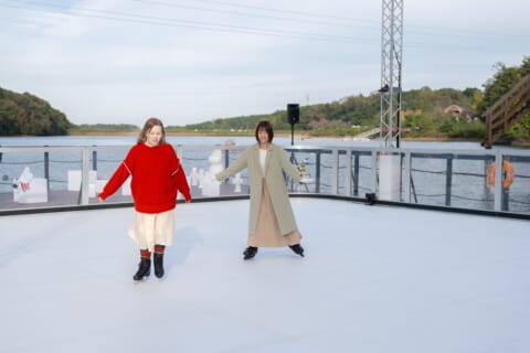 湖上のテラスに登場するスケートリンクは、環境に配慮した樹脂製のエコリンクを使用しており、スムーズで快適な滑りを楽しめます。転んでも服が濡れないため、スケート初心者やお子様も安心して利用できます。リンクの周りにはムーミンの仲間たちを描いた装飾も施され、ムーミン谷の仲間たちと一緒に遊んでいる気分を味わえます。