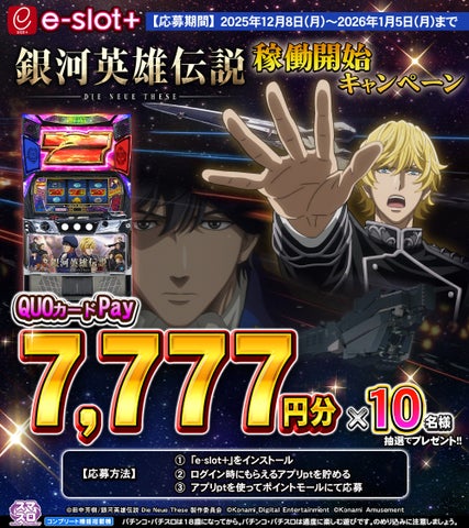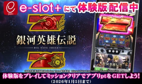 株式会社コナミアミューズメントは、累計発行部数1500万部を超える田中芳樹氏の小説を原作としたアニメシリーズ『銀河英雄伝説 Die Neue These』のスマスロ新機種の稼働開始を記念し、スマートフォンアプリ「e-slot+(イースロットプラス)」にて体験版を無料配信しています。
