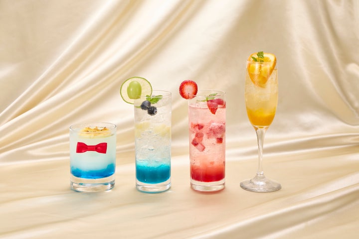 (左から)江戸川コナン レモン・ホワイトウォーター、工藤新一 アップル&ライムモヒート、毛利蘭 ストロベリーソーダ、鈴木園子 オレンジ&マンゴーソーダ
