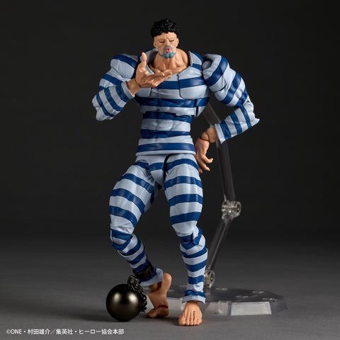 本商品は、山口勝久氏の総指揮による独自の可動設計により、ぷりぷりプリズナーの肉弾戦スタイルを幅広く表現します。縞の囚人服に包まれたマッチョボディと、アフロ&割れた顎の厳つい容貌を忠実に立体化しました。囚人の証である右足首の鉄球は、脚パーツの交換によって外した状態も再現可能です。