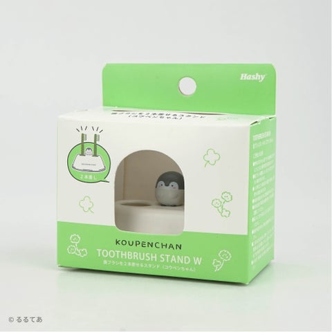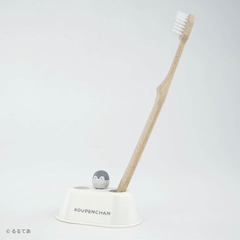 コウペンちゃんのフィギュアがちょこんと乗った「歯ブラシスタンドW(ダブル)」は、歯ブラシを2本立てられる便利なアイテムです。
