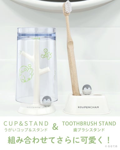 「うがいコップ&スタンド」と「歯ブラシスタンドW」を合わせて使用すると、コウペンちゃんの世界観をより一層楽しむことができます。