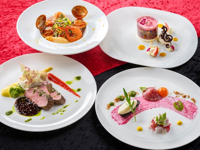 「リストランテ・ディ・カナレット」では、パラッツォ・カナルの運河やゴンドラをイメージしたアンティパスト・ミスト(前菜の盛り合わせ)や、遊び心あふれるデザートが特徴的なスペシャルセットを提供します。デザートは「ディズニーストーリービヨンド」のロゴがデザインされたフィルムに包まれたティラミス風で、苺のソースとマスカルポーネクリームが流れ出てくる仕掛けが、カーニバルの楽しさとワクワク感を表現しています。