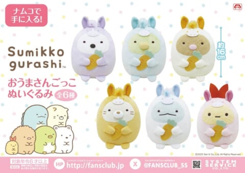 毎年恒例の干支の動物になりきる「ごっこぬいぐるみ」シリーズは今回で7回目を迎えます。2026年の干支である「午(うま)」にちなみ、すみっコたちが「おうまさんごっこ」の姿で登場します。各キャラクターが色違いの馬の着ぐるみを身につけたデザインで、集めて飾るのに最適なサイズ感です。2026年のお正月をすみっコたちと一緒にお迎えするのにぴったりのアイテムです。
