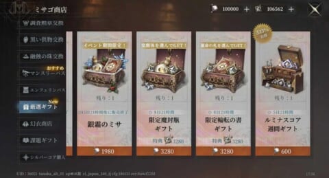 アップデートを記念して、お好きな常設覚醒体と常設運命の札を選べる特別な厳選ギフト「銀霜のミサ」が登場しました。 |