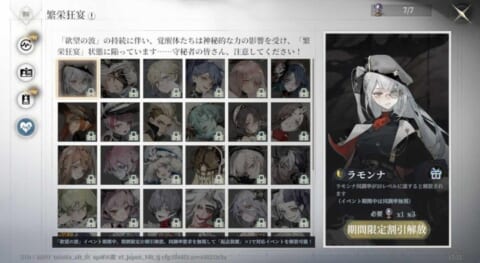 特別調査「繁栄狂宴」を追加しました。期間中は参加条件が「調査」1-7・通常をクリアで解放に緩和され、各覚醒体の必要同調率:なし、必要「起点装置」数:1に緩和されます。