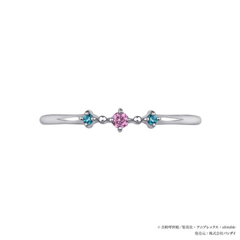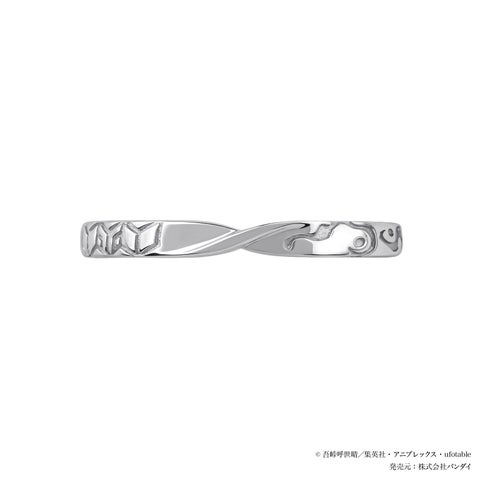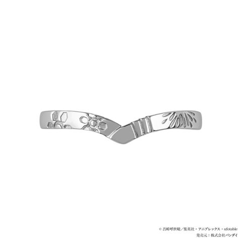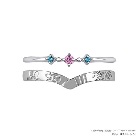 狛治・恋雪をイメージしたセットリングは、石付きリングのセンターに恋雪の着物をイメージしたピンクのストーンをセッティングし、サイドには狛治の目の色を思わせる水色のストーンを添えています。着物の衿をイメージしたV字のリングには恋雪の髪飾りと狛治の腕、そして結婚を誓い合った場面の花火を刻印で表現しました。一本でも、二本揃えても二人の永遠の愛を想起させるジュエリーです。