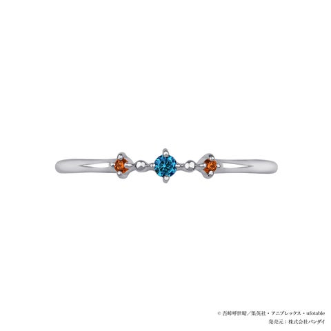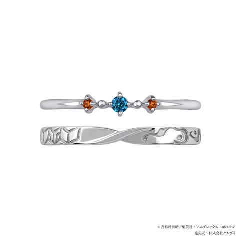 冨岡義勇をイメージしたセットリングは、石付きリングのセンターに義勇をイメージしたブルーのストーンをセッティングし、サイドには錆兎をイメージしたオレンジのストーンを添えています。地金のリングには羽織の文様と、戦いの中で頬に現れる痣を刻印で表現しました。時を越えて心の中で共に在り続ける二人の固い絆を感じさせるデザインで、デイリーに身につけやすいジュエリーです。
