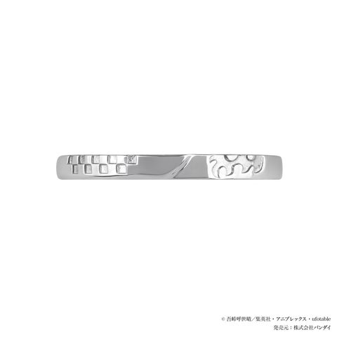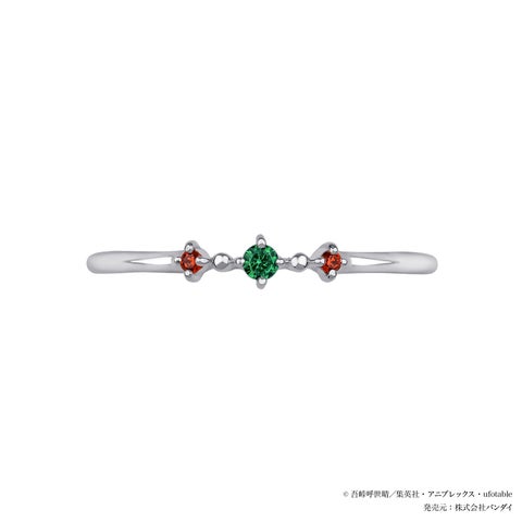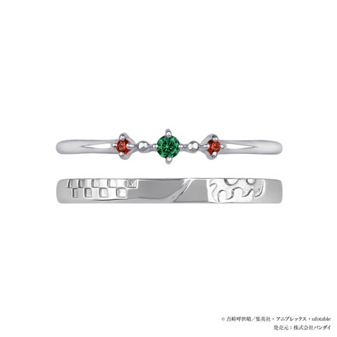 竈門炭治郎をイメージしたセットリングは、石付きリングのセンターに炭治郎をイメージした緑のストーンをセッティングし、サイドには「ヒノカミ神楽」や炭治郎の瞳をイメージした赤いストーンを添えています。地金のリングには羽織の市松模様と額の痣を刻印し、中央には日輪刀を思わせるデザインを施しました。不屈の精神で戦う炭治郎の姿と、時を越えて受け継がれる不滅の想いを形にした、日常使いしやすいジュエリーです。