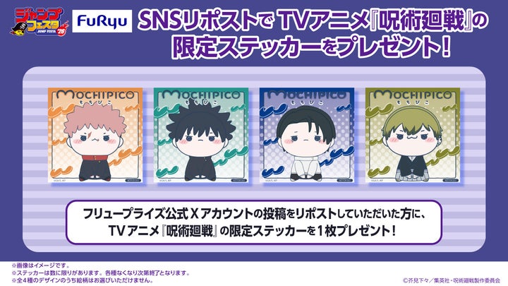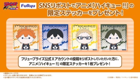 フリュープライズ公式Xアカウントの対象投稿をリポストした方に、「ハイキュー!!」または「呪術廻戦」の『もちぴこ』デザイン限定ステッカーをプレゼントします。各作品4種類のデザインがあり、ランダムで1枚をゲットできます。フリューブースにてスタッフにリポスト投稿を提示してください。お好きな作品を選択できますが、絵柄はランダム提供です。詳細はフリューブース内の掲示物をご確認ください。