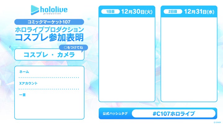 コミックマーケット107の開催に合わせて、「コスプレ・カメラ参加表明」画像を公開中です。ハッシュタグ「#C107ホロライブ」を活用し、コスプレ活動にご利用ください。