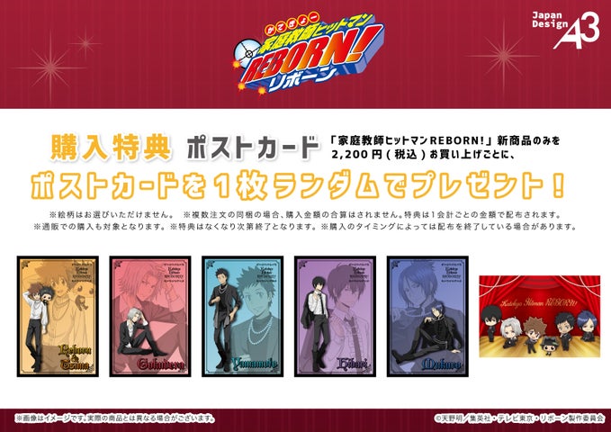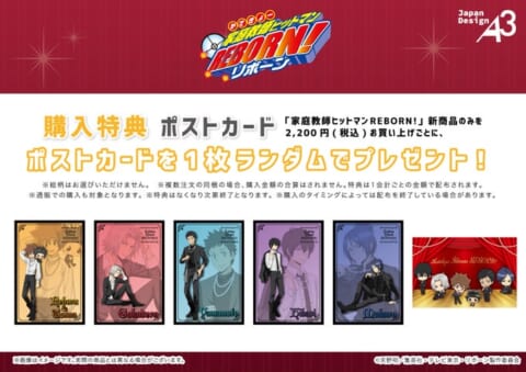 TVアニメ『家庭教師ヒットマンREBORN!』の新商品のみを2,200円(税込)お買い上げごとに、ポストカード(全6種)をランダムで1枚プレゼントします。グッズと同じ描き下ろし&オリジナルミニキャライラストを使用した特別なポストカードです。通販での購入も対象となります。