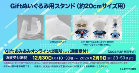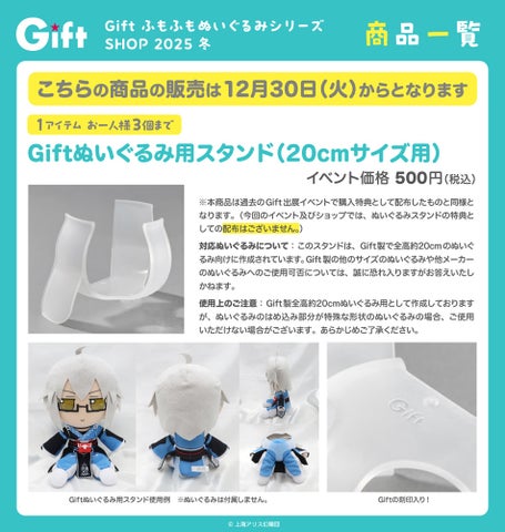 上記の作品群から新作ぬいぐるみやグッズが登場するほか、「Giftぬいぐるみ用スタンド(20㎝サイズ用)」も販売します。