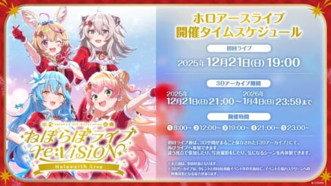 ホロライブ5期生「ねぽらぼ」がバーチャル空間「ホロアース」で「ねぽらぼライブ re:VISION Holoearth Live」を2025年12月21日に開催します。没入感あふれるライブ体験と、ホロアース限定の3Dアーカイブや特別パート、さらにデジタル・リアルグッズなど、本イベントの詳細をお届けします。
