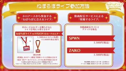 本ライブへの参加方法は、ホロアースから参加する「ねぽらぼに会えるライブ」と、動画配信サービスによる「視聴するライブ」の2種類を用意しています。