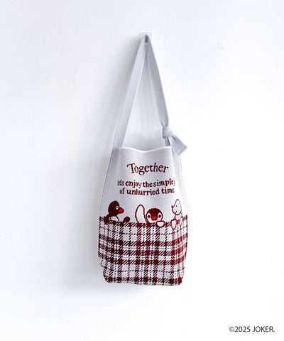 KNT365の代表的なバッグ「Knitty」や「Mam」とは異なる、多色デザインが魅力の「Fourty」です。ブラウンのチェック柄から顔を出すピングーやピンガ、ロビが愛らしいデザインです。マチがあり大容量で、ショルダー部分は長さの調整が可能です。