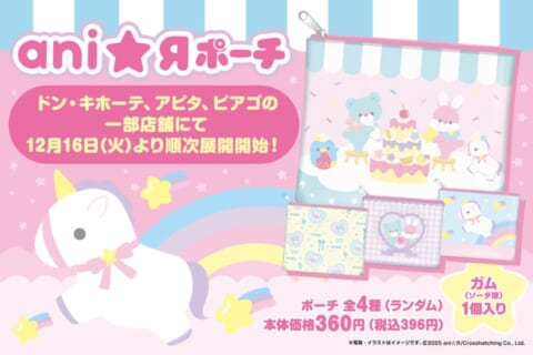 2025年12月16日より、キャラクターブランド「ani☆Я」のガム入りポーチがドン・キホーテ、アピタ、ピアゴの一部店舗で順次販売を開始します。全4種類の「ゆめかわ」デザインのポーチは、チューインガムとセットで396円(税込)で提供します。