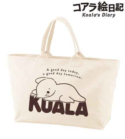 コアラさんのイラストとキャッチコピー「今日もいい日、明日もいい日。」をデザインしたBIGなジップトートバッグです。厚みのある生地とジッパー付きの開け口で、大容量の収納に適しています。イベントや旅行などの特別な日から日常使いまで、様々なシーンで活用できます。