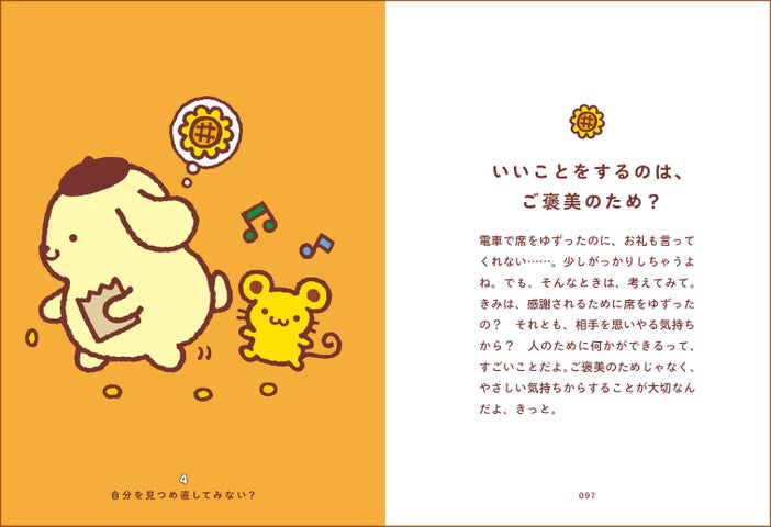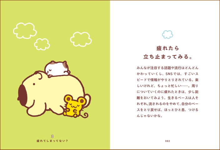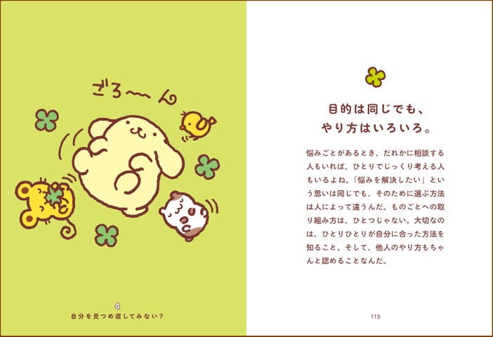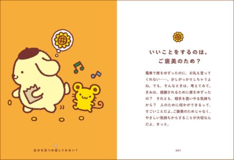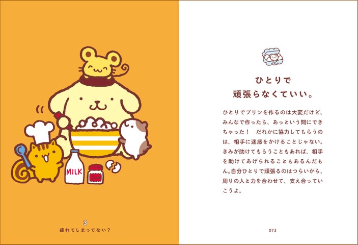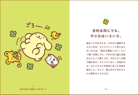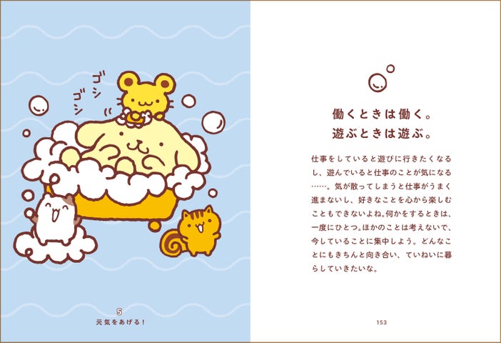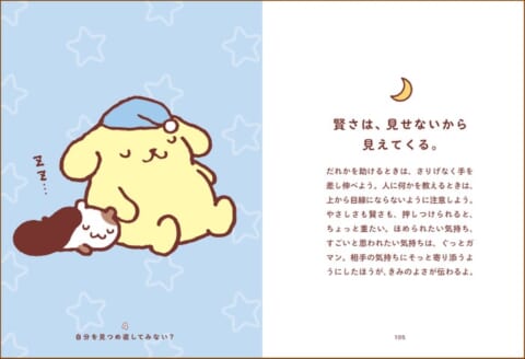 1イラスト+1メッセージという読みやすい構成のため、忙しい日々のちょっとした息抜きや、寝る前のリラックスタイムにも最適です。癒やしを求めるすべての人に贈る、心温まる一冊となるでしょう。本書は2015年刊『ポムポムプリン 毎日がうまくいくちょっとしたコツ』の新装復刊版です。