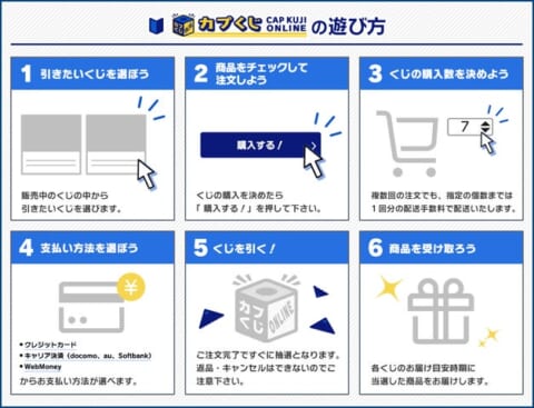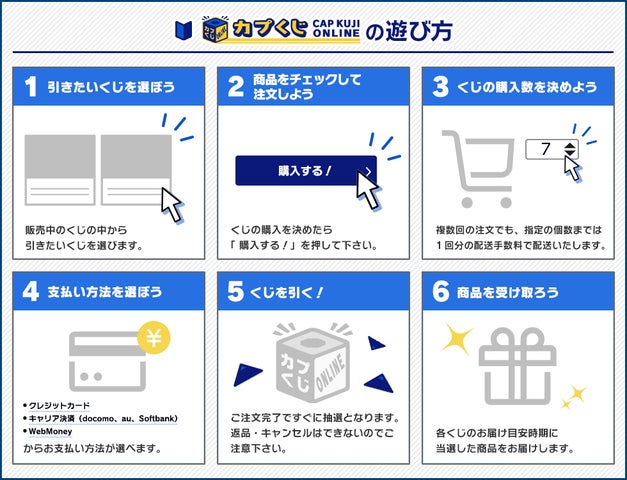 「カプくじオンライン」は、スマートフォンやPC等のWEBサイトから利用できる、ハズレなしのオンラインくじサービスです。手軽にくじを引いて、特別な商品を自宅まで直接届けることができます。カプコン限定の商品やオリジナルグッズなど、様々な企画を展開しています。