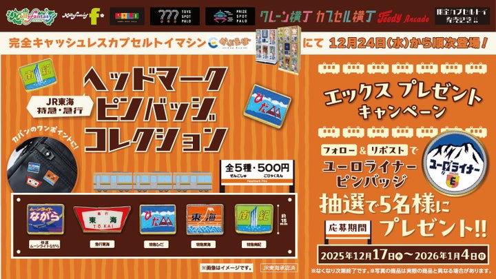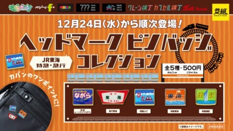 JR東海特急・急行ヘッドマークのピンバッジがカプセルトイ「かぷえぼ」で2025年12月24日より順次登場します。全5種類のコレクションとSNSキャンペーン情報です。