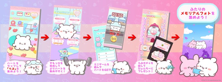 本作は、ハートを集めて「らぶ」を溜め、キャラクターを育成しながら“ふたりのメモリアルフォト”をコレクションしていく放置系×育成×フォト収集ゲームです。メモリアルフォトは本作限定の描き下ろしイラストで全50枚を用意しており、世界各地を旅する『ぴょんちー』と『すもっぴ』の楽しい旅行風景を楽しめます。集めたメモリアルフォトはスマートフォンの壁紙としても設定可能です。