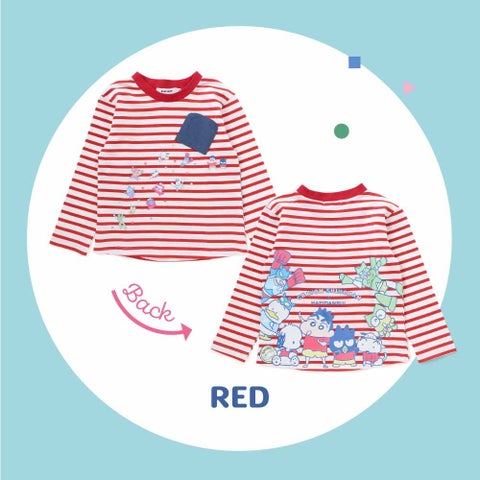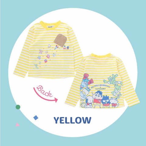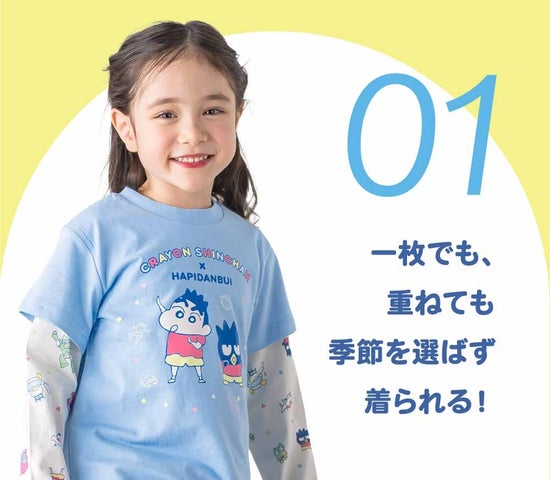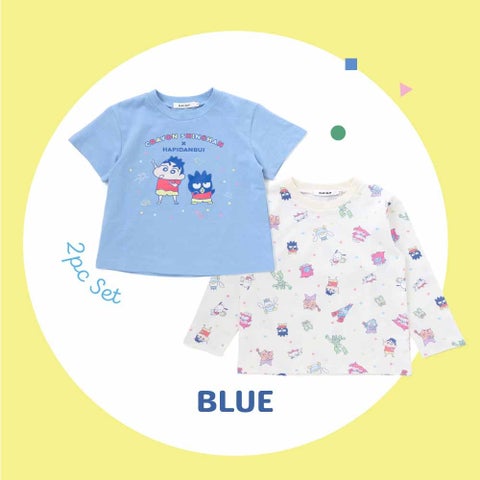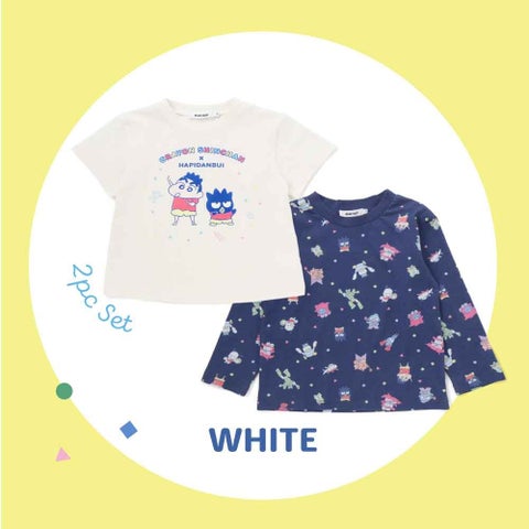 半袖Tシャツと長袖Tシャツがセットになった、重ね着も楽しめるアイテムです。半袖Tシャツには、しんちゃんとバッドばつ丸のプリントが施されています。長袖Tシャツは、「クレヨンしんちゃん」と『はぴだんぶい』のキャラクターたちが仲良く登場する総柄デザインです。遊び心あふれるデザインで、コーディネートの主役となる一着です。