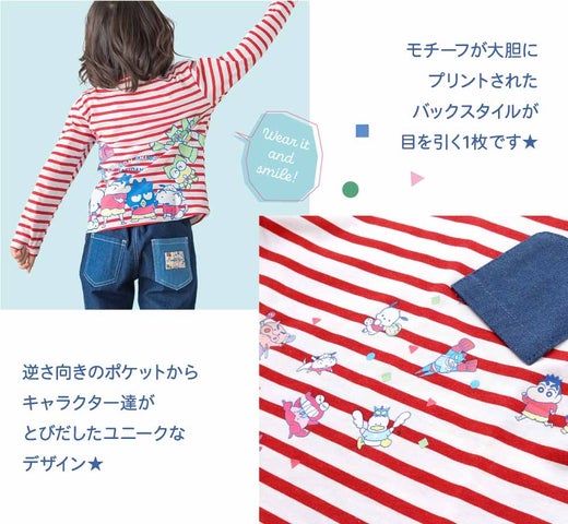 「クレヨンしんちゃん」と『はぴだんぶい』のキャラクターが大集合した、遊び心に満ちた長袖Tシャツです。下向きに配置されたポケットからキャラクターたちが飛び出すユニークなデザインが特徴。バックスタイルもインパクトがあり、目を引くアイテムに仕上がっています。
