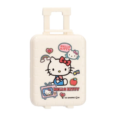サンリオキャラクターのステッカーを貼り付けたようなデザインのミニチュアキャリーケースが登場します。