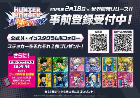 『HUNTER×HUNTER NEN×SURVIVOR』公式Xまたは公式Instagramをフォローすると、ランダムステッカー(全12種)をそれぞれ1枚ずつプレゼントします。さらに、ハッシュタグ「#ジャンプフェスタ」「#ネンサバ」を付けてブースの写真をXまたはInstagramに投稿すると、追加でもう1枚ステッカーを獲得できます。