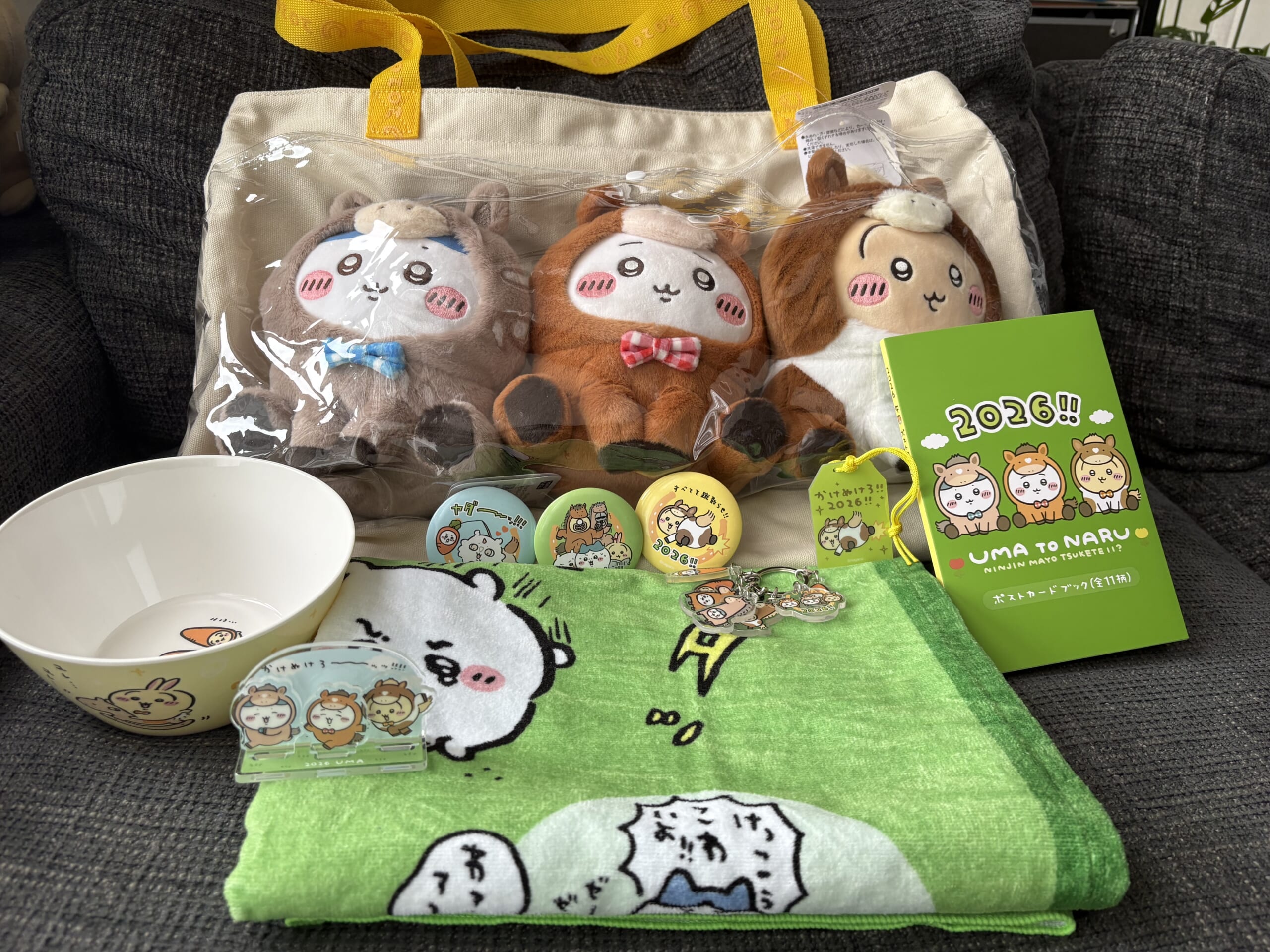 結論から言うと、2026年版は「ウマになったちいかわ・ハチワレ・うさぎ」の可愛さと、オタ活バッグとして完成度の高いトートが主役。日用品(タオル・ボウル)も実用的で、全体のバランスが良い福袋でした。