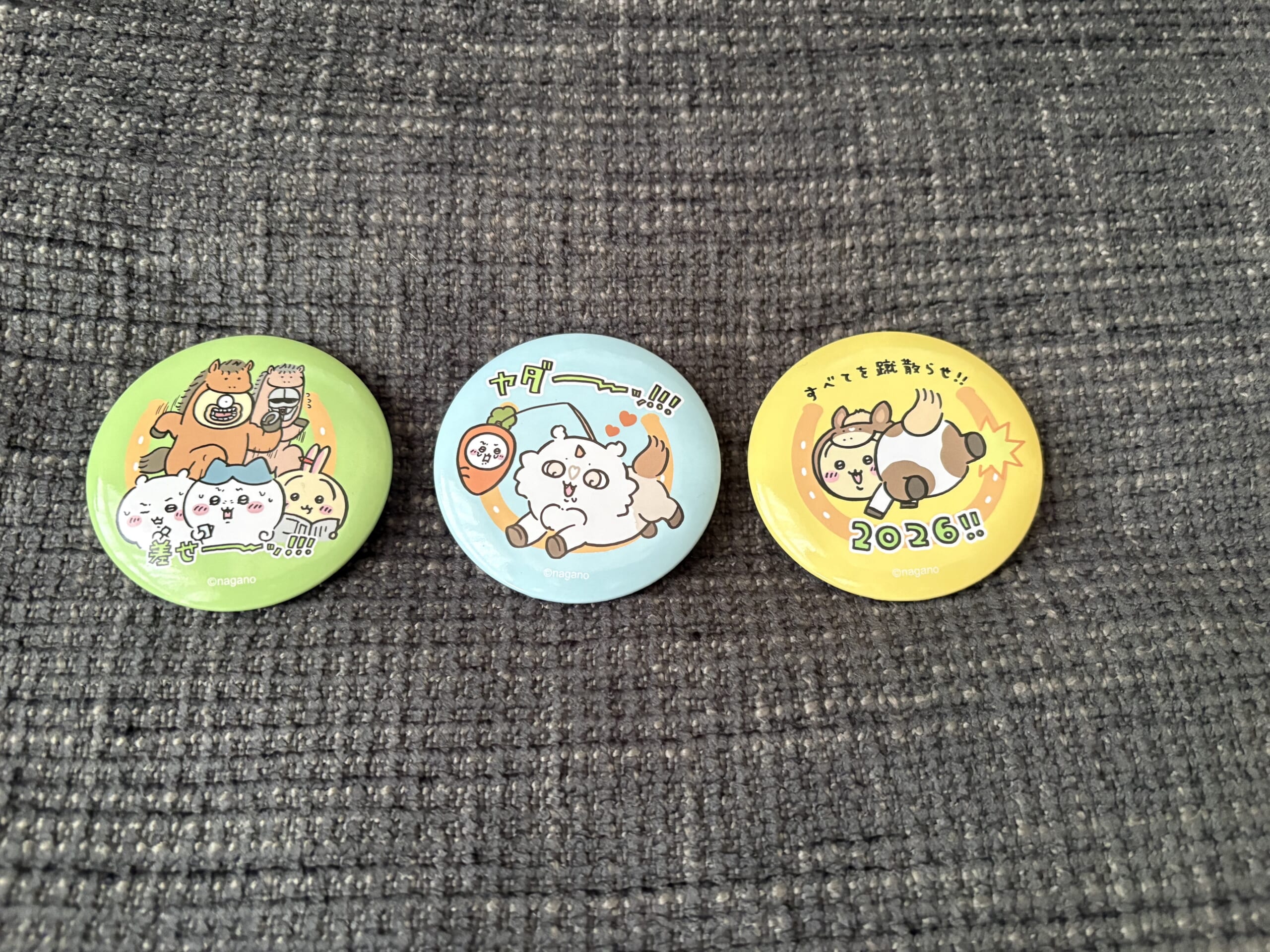 キャラのパーソナルカラーに寄せた配色で、3つ並べると満足感が高いセット。直径約57mmで、痛バッグにも使いやすいサイズです。