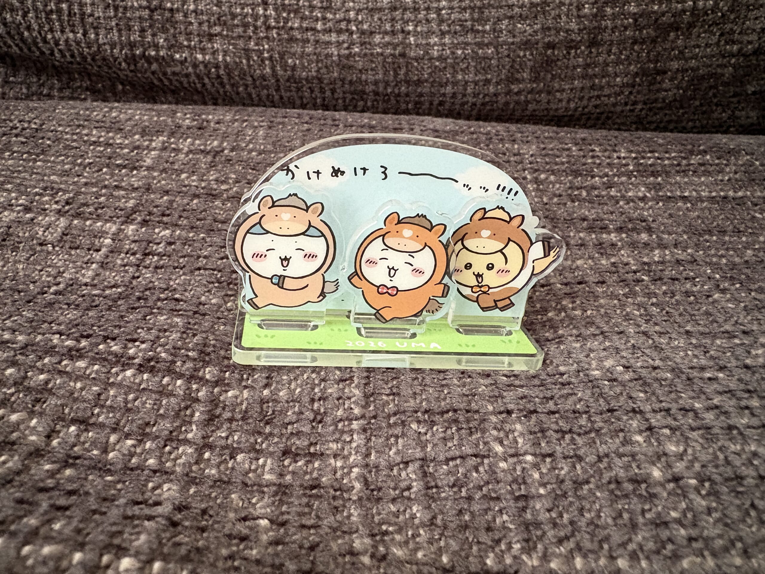 3人が並んで「ウマ」になっている姿を立体で飾れるのがアクスタの強み。デスクに置くと、仕事中に視界に入って元気が出ます。