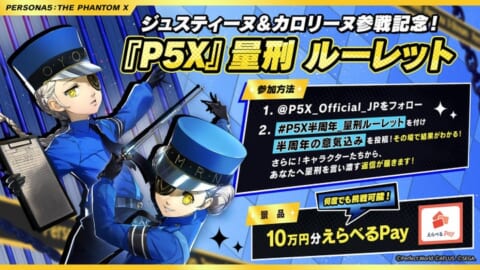 『P5X』公式X(@P5X_Official_JP)をフォローし、ハッシュタグ「#P5X半周年_量刑ルーレット」を付けて半周年の意気込みを投稿すると、その場で抽選結果が分かります。さらに、キャラクターたちから個性溢れる「量刑」を言い渡す返信が届きます。