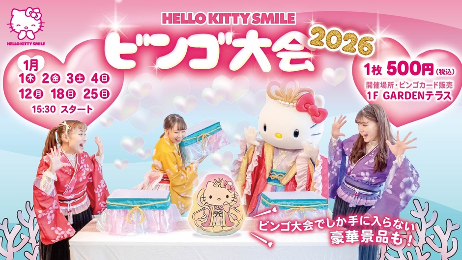 - 料金: ビンゴカード1枚500円(別途HELLO KITTY SMILE入場料が必要です。4歳以上の方はワンオーダーをお願いします。)