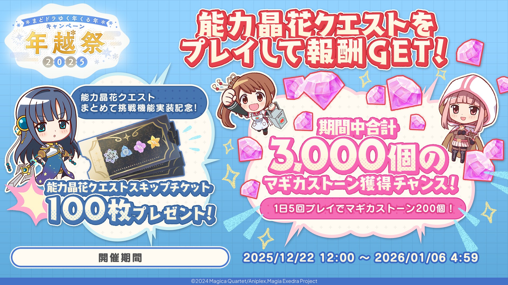 配布期間: 2025年12月21日18時30分~2026年1月5日11時59分 - 能力晶花クエストプレイミッション開催(合計マギカストーン3,000個獲得可能)