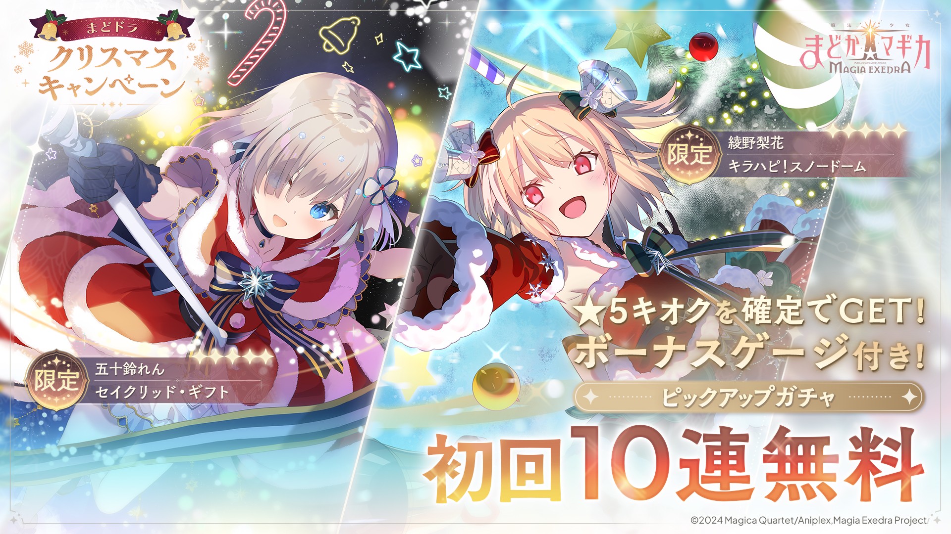アプリゲーム『魔法少女まどか☆マギカ Magia Exedra』では、アニメ最終話放送を記念し2025年12月21日18時30分よりマギカストーン3,000個プレゼントや限定★5アルティメットまどかが復刻。さらに2025年12月22日12時からはクリスマスイベントとしてクリスマス衣装の五十鈴れんまたは綾野梨花の★5キオクを無料でプレゼントします。豪華なキャンペーンの詳細をぜひ参考にしてください。