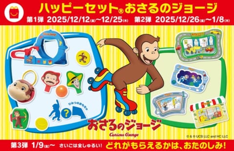 現在販売中のハッピーセット「おさるのジョージ」は、85周年のスタートを盛り上げています。2025年12月26日(金)からは第2弾が登場し、両面で遊べるジグソーパズルを提供。裏面はパズルを組み立てた後、間違い探しやめいろ、飾りとしても楽しめます。