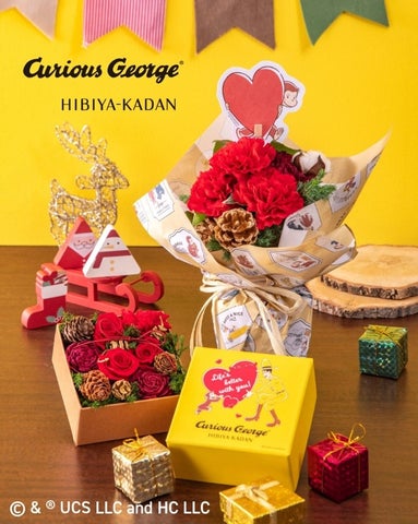 株式会社日比谷花壇とのコラボレーションにより、「おさるのジョージ」限定デザインのプリザーブド&ドライフラワーアレンジメントやそのまま飾れるブーケが販売中です。クリスマスシーズンにぴったりのオリジナルアイテムです。