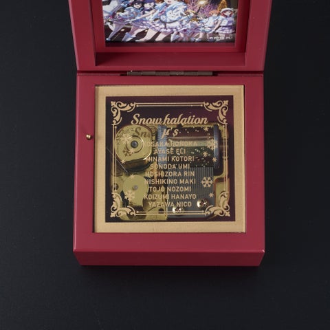 このメモリアルオルゴールは、細部にわたるこだわりが詰まった豪華な仕様が特徴です。蓋の内側には、「Snow halation」のステージ衣装をまとったμ’sメンバーの美麗なイラストがあしらわれています。ボックスを開くと、ガラス製の蓋越しに金メッキのオルゴールメカが見える構造となっており、所有する喜びを高めます。発売15周年にふさわしい、記念品としても最適なアイテムです。