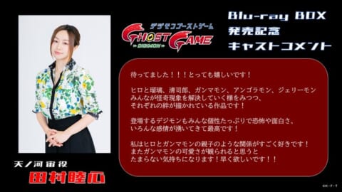 ファン待望のTVアニメ『デジモンゴーストゲーム』初のBlu-rayBOXの発売が決定しました。発売を記念し、天ノ河宙役の田村睦心さんよりコメントが寄せられています。詳細情報は今後の続報にて発表されます。