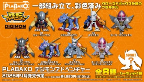 クローズドボックス仕様のデジモンプラモデル『PLABAKO(プラバコ)』が2026年春に発売されます。「専用透明ケース」に入っており、組み立てるだけでなく、そのまま収納してディスプレイすることも可能です。全8種に加えシークレット1種の全9種がラインナップされ、メタリックカラーやクリアカラーVer.もあり、異なる質感を楽しめます。